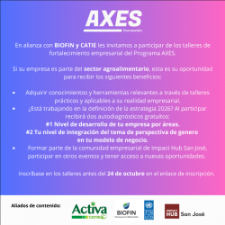 Impact Hub San José, Activa-CATIE, BIOFIN y PNUD le invitan a participar en los talleres de fortalecimiento empresarial del Programa AXES, diseñados especialmente para emprendedores y empresas del sector agroalimentario. Financiado por Al Invest Verde, Biofin – PNUD y Fundación Argidius